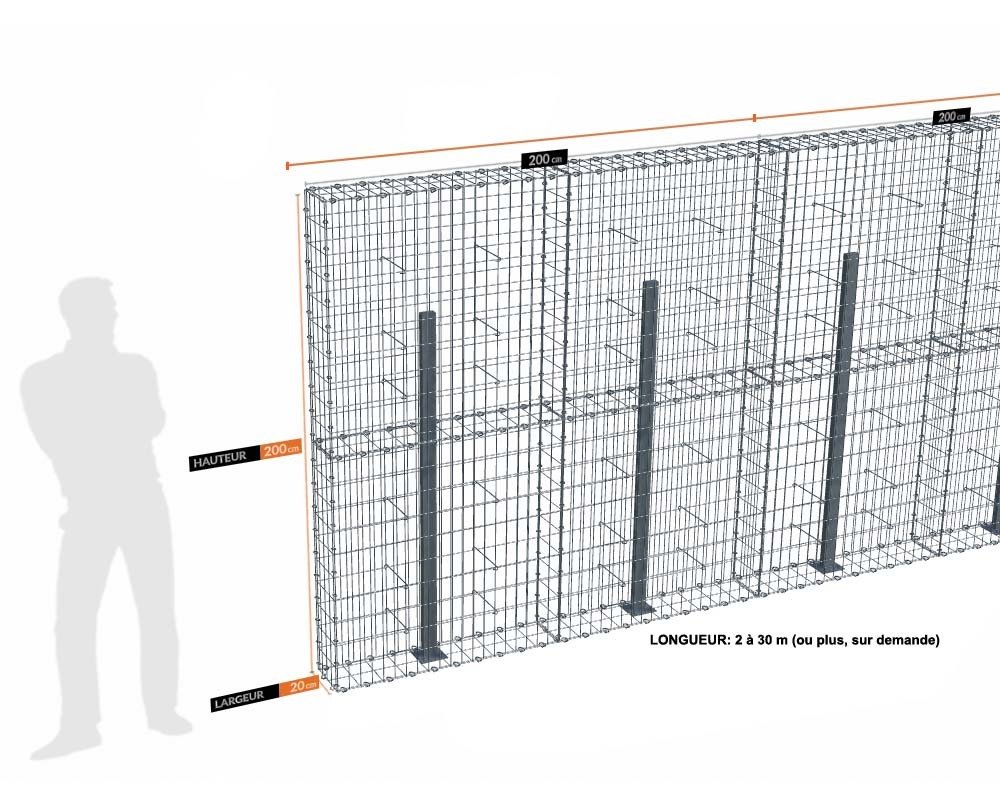 Kit gabion 200cm (H) x 20cm (L), pour clôture, assemblage agrafes, mailles 5 x 10 cm, avec poteaux raidisseurs à visser. Kit de 8 m de longueur. Ces gabions sont livrés complets, sans les pierres, et à assembler. Mailles de 5 cm x 10 cm en fils de 4,5 mm sur les faces visibles. Mailles de 10 cm x 10 cm en fils de 4 mm sur les faces invisibles.