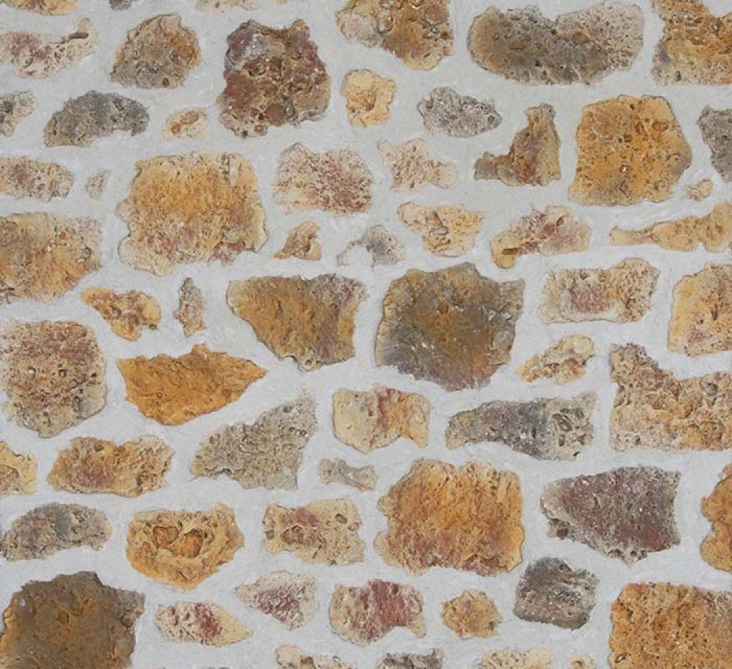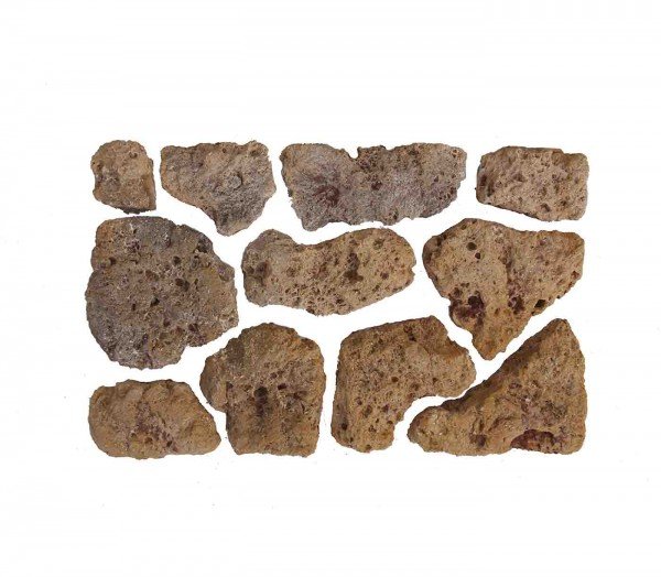 Les pierres de MEULIÈRE ont un relief caverneux et coquillé, leur surface est rugueuse. Les formes et les tailles des pierres sont variées.