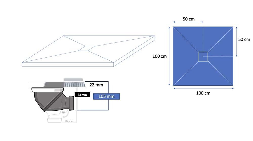 Receveur résine 100 x 100 cm blanc imitation ardoise - grille carrée inox blanc centrée avec siphon 360° vertical horizontal, natte étanche pré-montée
