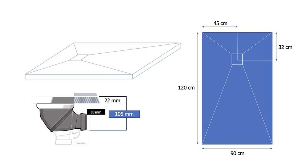 Receveur résine 120 x 90 cm blanc imitation ardoise - grille carrée excentrée inox blanc avec siphon 360° vertical horizontal, natte étanche pré-montée