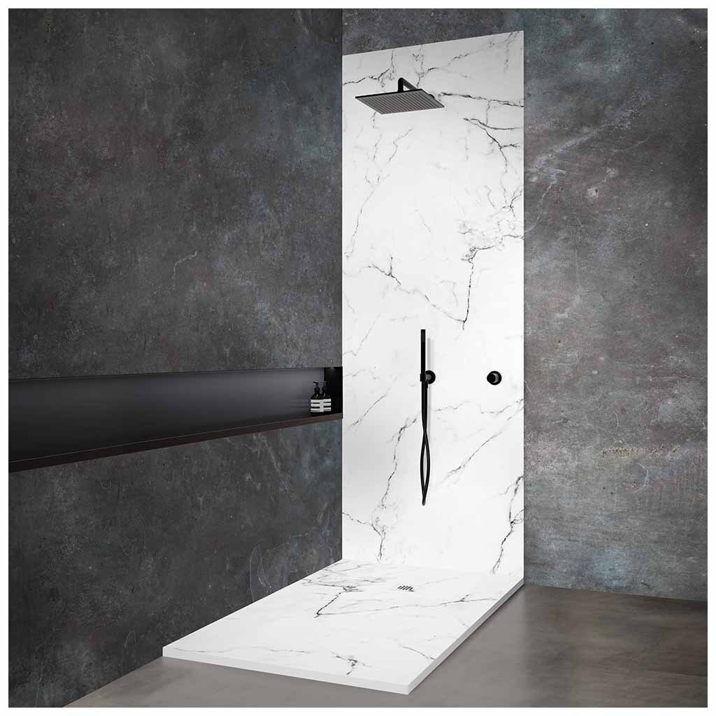 Receveur résine 180 x 80 cm imitation marbre noir - grille carrée inox noir Marbre excentrée avec siphon 360° vertical horizontal, natte étanche pré-montée