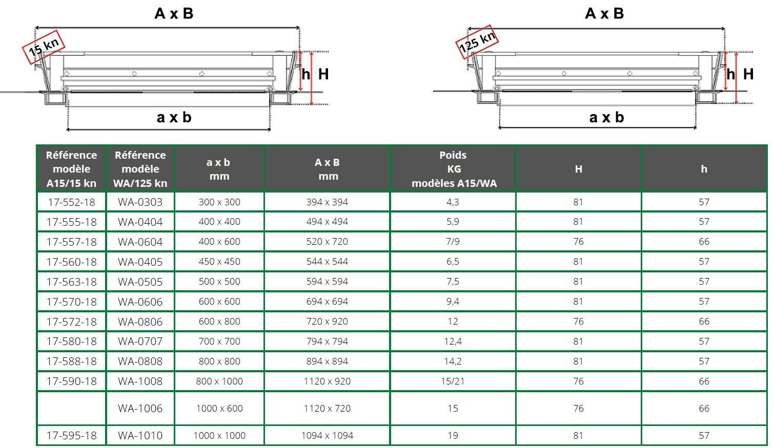 - charge d'essai de 15 KN selon la norme NF EN 124 quand la couverture est entièrement rempli de béton C35/45 (selon norme NF EN