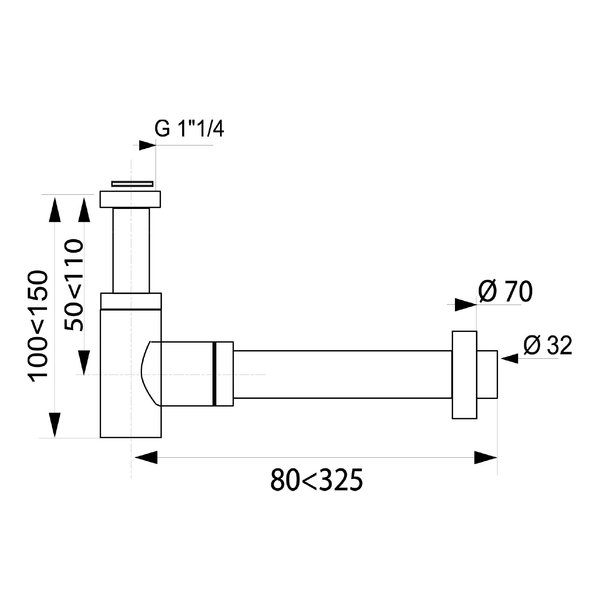 Siphon chromé court, adapté également aux lave-mains SOLO. 1’1/4 x Ø 32 x H100-150 Culot court de 100 à 150mm hors tout