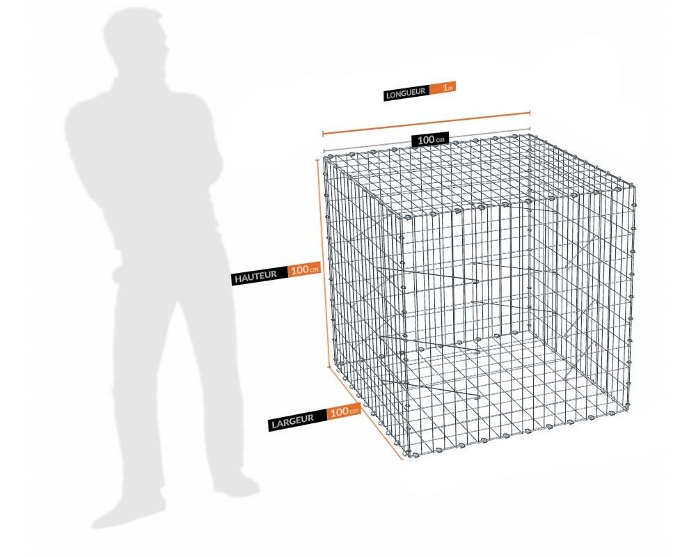 Gabion, longueur 100cm x 100cm(H) x 100(L), assemblage agrafes, mailles 5 x 10 cm, grilles non visibles mailles 10 x 10 cm Ø4mm
