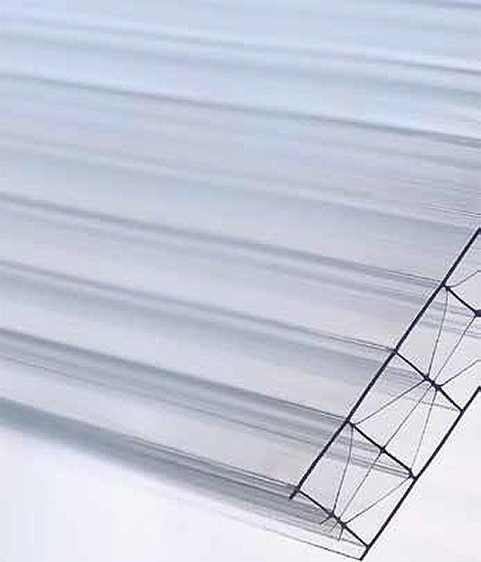 Plaque en polycarbonate 5 parois d’une épaisseur totale de 16 mm, dotée d’une structure en X pour une rigidité améliorée. Elle combine transmission élevée de la lumière, propriétés porteuses remarquables, bonne isolation thermique et excellente résistance aux intempéries. La plaque est légère, résistante aux chocs et très facile à poser.