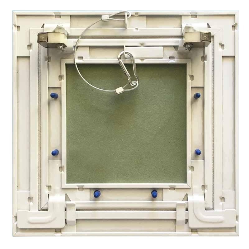 Cadre en alu laqué blanc (RAL 9016) pour une finition parfaite. Vantail en plaque de plâtre hydrofuge muni d'un joint feutrine anti poussière.