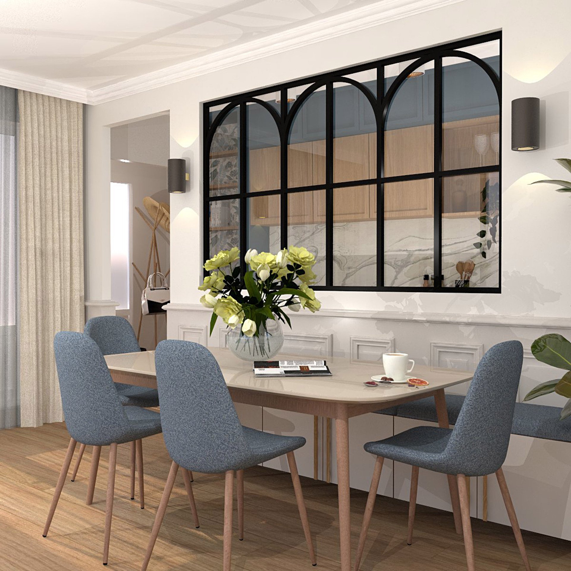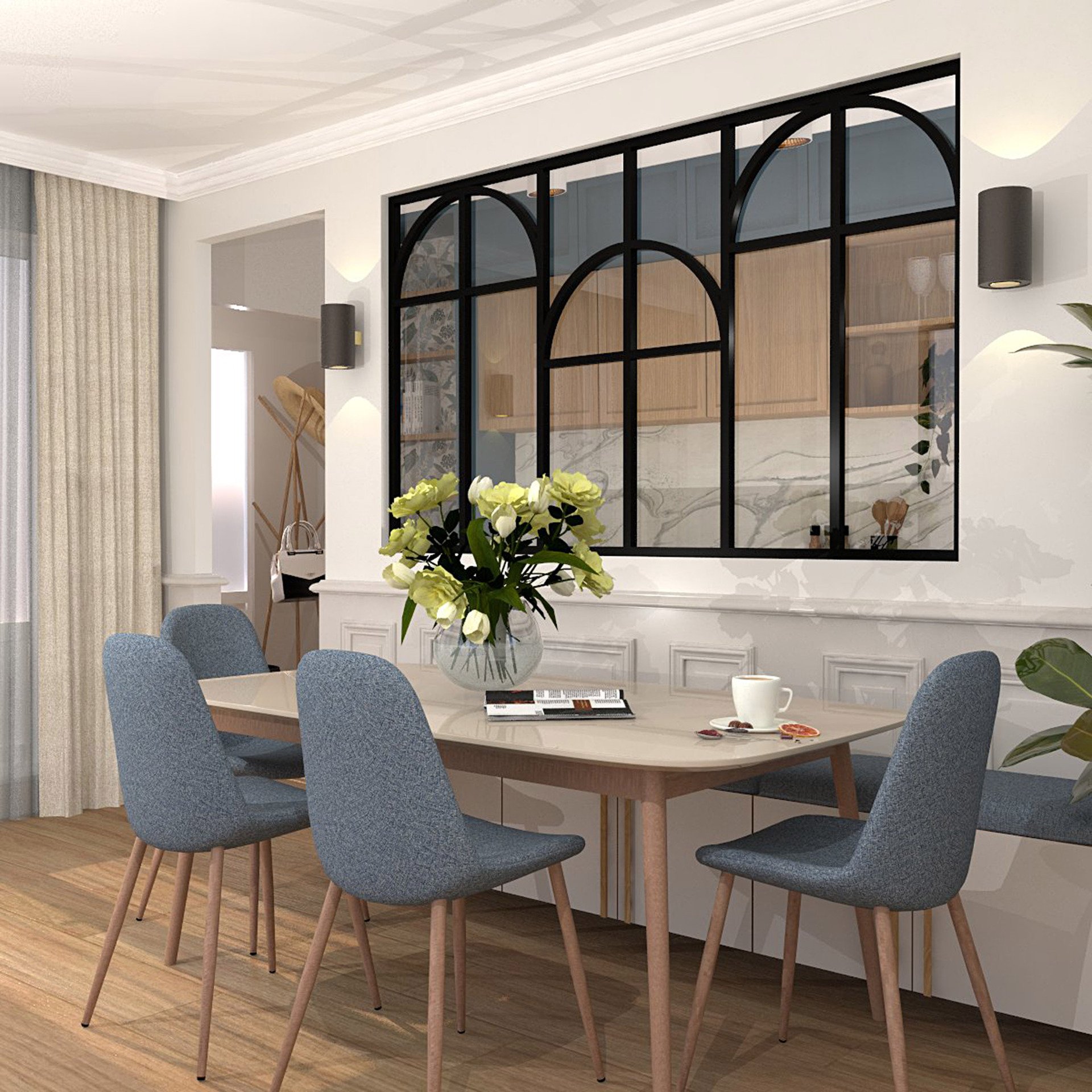 Verrière type atelier 6 vitrages clairs avec 6 arches et 6 traverses décoratives, chassis noir, largeur 207 cm